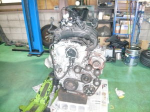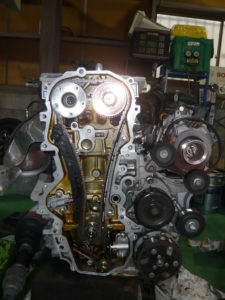 車から降ろしたエンジンはこちらです。タイミングチェーン、カムスプロケットとVTCアクチュエーターの交換はエンジンを車体から降ろす必要があります。